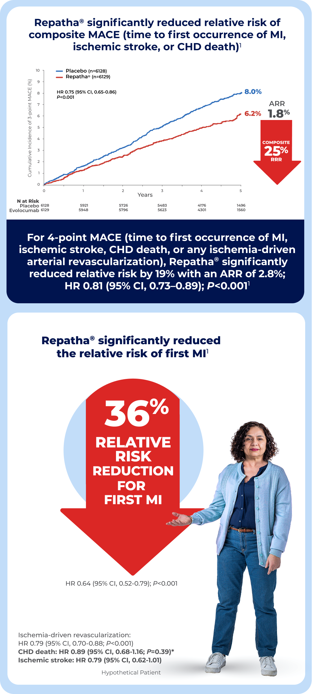References: 1. Repatha® (evolocumab) prescribing information, Amgen. 2. Sabatine MS, Giugliano RP, Keech AC, et al; FOURIER Steering Committee and Investigators. Evolocumab and clinical outcomes in patients with cardiovascular disease. N Engl J Med. 2017;376:1713-1722. 3. Gencer B, Mach F, Murphy SA, et al. Efficacy of evolocumab on cardiovascular outcomes in patients with recent myocardial infarction: a prespecified secondary analysis from the FOURIER trial. JAMA Cardiol. 2020;5:952-957. 4. Gencer B, Mach F, Murphy SA, et al. Efficacy of evolocumab on cardiovascular outcomes in patients with recent myocardial infarction: a prespecified secondary analysis from the FOURIER trial. JAMA Cardiol. 2020;5:952-957. Supplementary Online Content. doi:10.1001/jamacardio.2020.0882 5. Jernberg T, Hasvold P, Henriksson M, Hjelm H, Thuresson M, Janzon M. Cardiovascular risk in post-myocardial infarction patients: nationwide real world data demonstrate the importance of a long-term perspective. Eur Heart J. 2015;36:1163-1170. 6. Furtado RHM, Fagundes AA, Oyama K, et al. Effects of evolocumab in patients with prior percutaneous coronary intervention: an analysis from the FOURIER trial. Presented at: American Heart Association Scientific Sessions 2020; November 13-17, 2020. 7. Furtado RHM, Fagundes AA Jr, Oyama K, et al. Effect of evolocumab in patients with prior percutaneous coronary intervention. Circ Cardiovasc lnterv. 2022;15:e011382. 8. Sabatine MS, Leiter LA, Wiviott SD, et al. Cardiovascular efficacy & safety of evolocumab in diabetes, and risk of development of diabetes: an analysis from the FOURIER trial. Presented at: 53rd Annual Meeting of the European Association for the Study of Diabetes; Lisbon, Portugal; September 15, 2017. 9. Sabatine MS, Leiter LA, Wiviott SD, et al. Cardiovascular safety and efficacy of the PCSK9 inhibitor evolocumab in patients with and without diabetes and the effect of evolocumab on glycaemia and risk of new-onset diabetes: a prespecified analysis of the FOURIER randomised controlled trial. Lancet Diabetes Endocrinol. 2017;5(12):941-950. doi:10.1016/S2213-8587(17)30313-3 10. Bonaca MP, Nault P, Giugliano RP, et al. Low-density lipoprotein cholesterol lowering with evolocumab and outcomes in patients with peripheral artery disease: insights from the FOURIER Trial (Further Cardiovascular Outcomes Research with PCSK9 Inhibition in Subjects With Elevated Risk). Circulation. 2018;137:338-350. 11. Data on file, Amgen; 2022. 12. O’Donoghue ML, Giugliano RP, Wiviott SD, et al. Long-term evolocumab in patients with established atherosclerotic cardiovascular disease. Circulation. 2022;146:1109-1119. 13. Lloyd-Jones DM, Morris PB, Ballantyne CM, et al. 2022 ACC expert consensus decision pathway on the role of nonstatin therapies for LDL-cholesterol lowering in the management of atherosclerotic cardiovascular disease risk: a report of the American College of Cardiology Solution Set Oversight Committee. J Am Coll Cardiol. 2022;80:1366-1418. 14. Chen C-C, Rane PB, Hines DM, Patel J, Harrison DJ, Wade RL. Low-density lipoprotein cholesterol outcomes post-non-PCSK9i lipid-lowering therapies in atherosclerotic cardiovascular disease and probable heterozygous familial hypercholesterolemia patients. Ther Clin Risk Manag. 2018;14:2425-2435. 15. Data on file, Amgen; 2025. 16. Gaba P, O’Donoghue ML, Park J-G, et al. Association between achieved low-density lipoprotein cholesterol levels and long-term cardiovascular and safety outcomes: an analysis of FOURIER-OLE. Circulation. 2023;147:1192-1203. 17. Giugliano RP, Mach F, Zavitz K, et al. Cognitive function in a randomized trial of evolocumab. N Engl J Med. 2017;377:633-643.